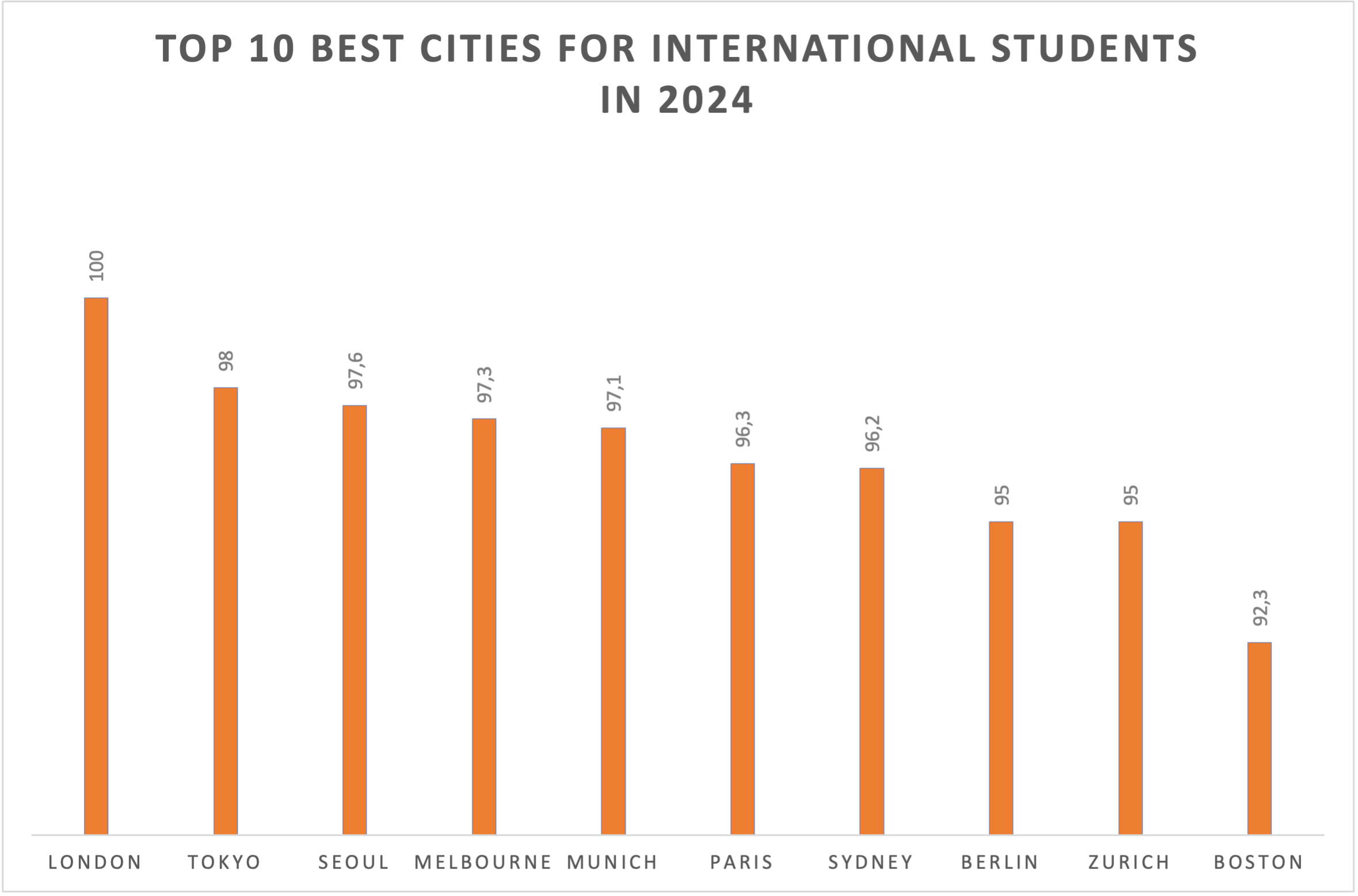Last but not least, ahead of New York city, the only city of the United States in the top 10 best destinations for international students is Boston. Home to MIT and Harvard, has a high ranking in the university rankings indicator. This is also thanks to Boston’s exceptional performance in employer activity, which highlights the prestigious reputation of its universities among employers worldwide.